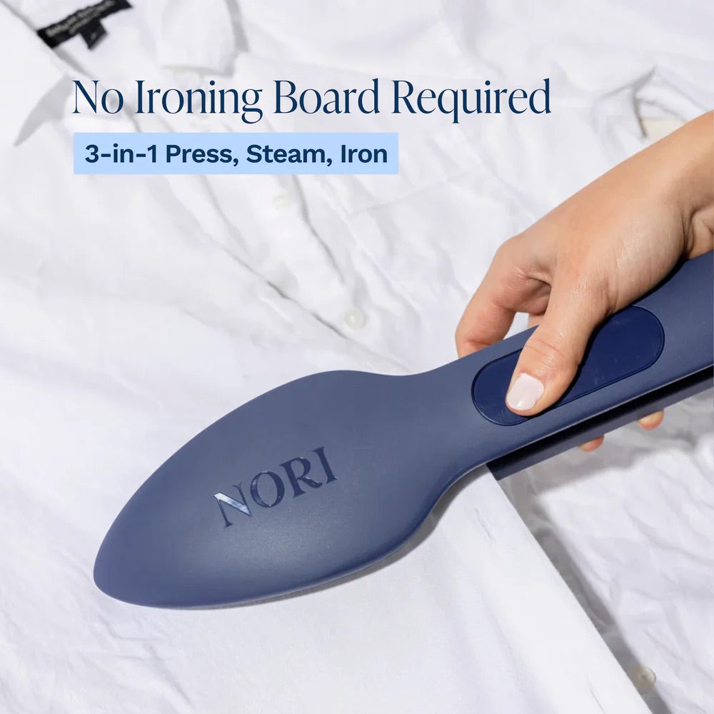 The Nori Press is a handheld steam iron that requires no ironing board. It features six fabric-specific heat settings, a steam function, elongated arms for better reach, and dual heated aluminum plates that press both sides of a garment at the same time.